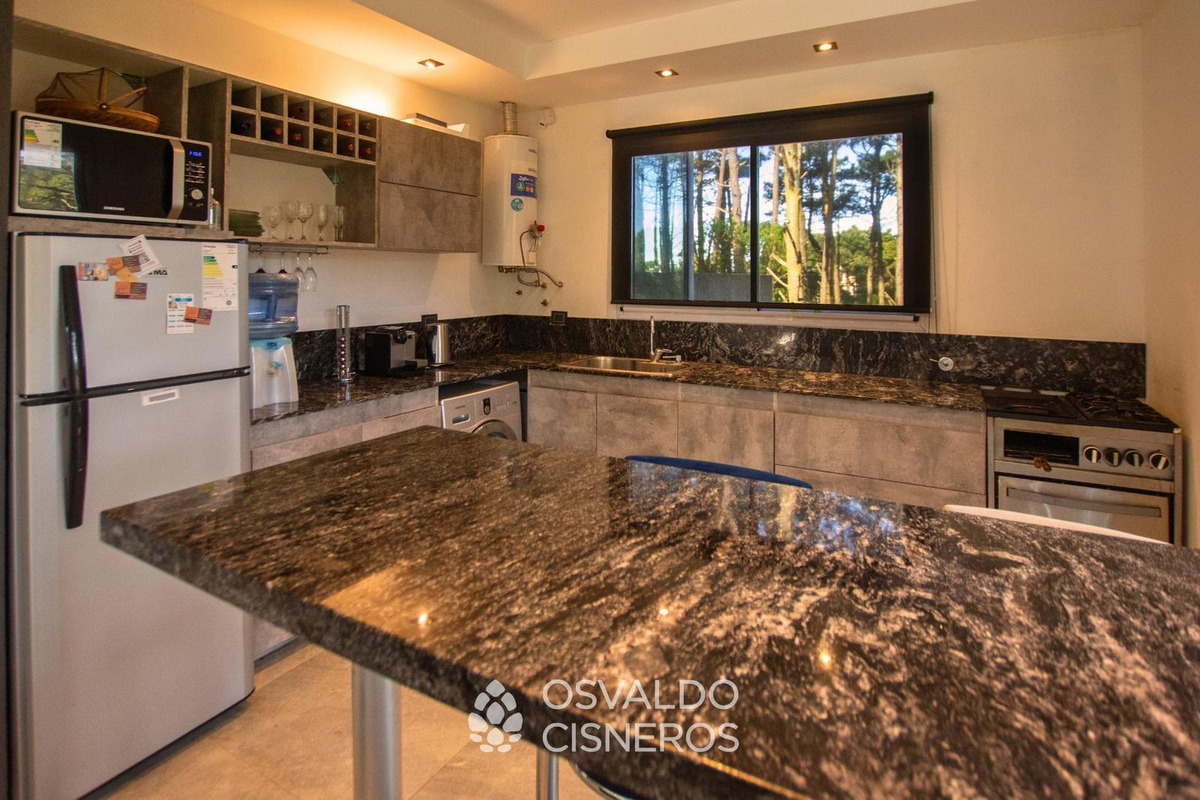 Dispone de 4 dormitorios: dos matrimoniales, uno matrimonial con cama simple y otro con dos camas simples. Cuenta con 3 baños completos con ducha. En el exterior ofrece una terraza con parrilla y vista al bosque, además de un espacio semicubierto para estacionar.