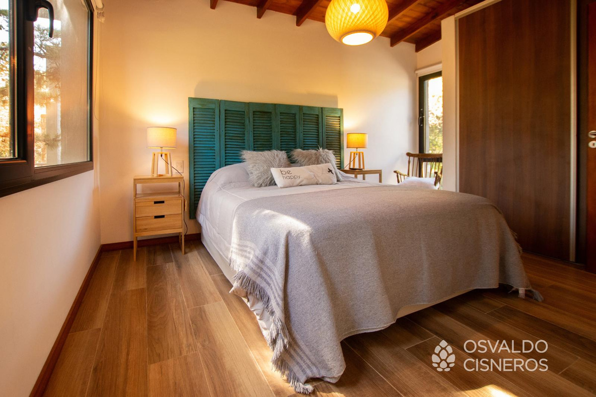 Dispone de 3 dormitorios (2 en suite) más un estar con cama simple, y un total de 3 baños completos (dos en suite y uno general). En el exterior cuenta con un deck con parrilla, mesa y bancos de hormigón a la vista.